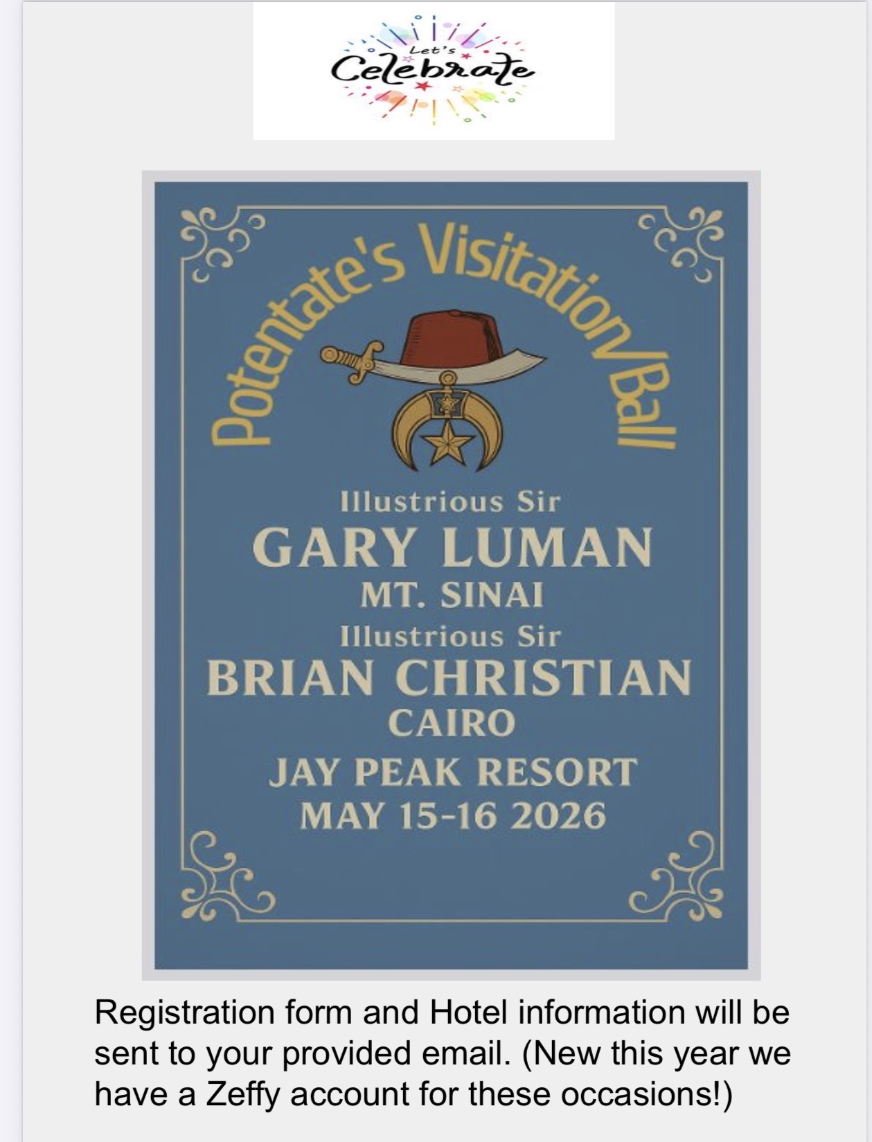 Greetings! Come enjoy Fun and Fellowship at the Potentate’s Visitation/Ball(Click here for details)